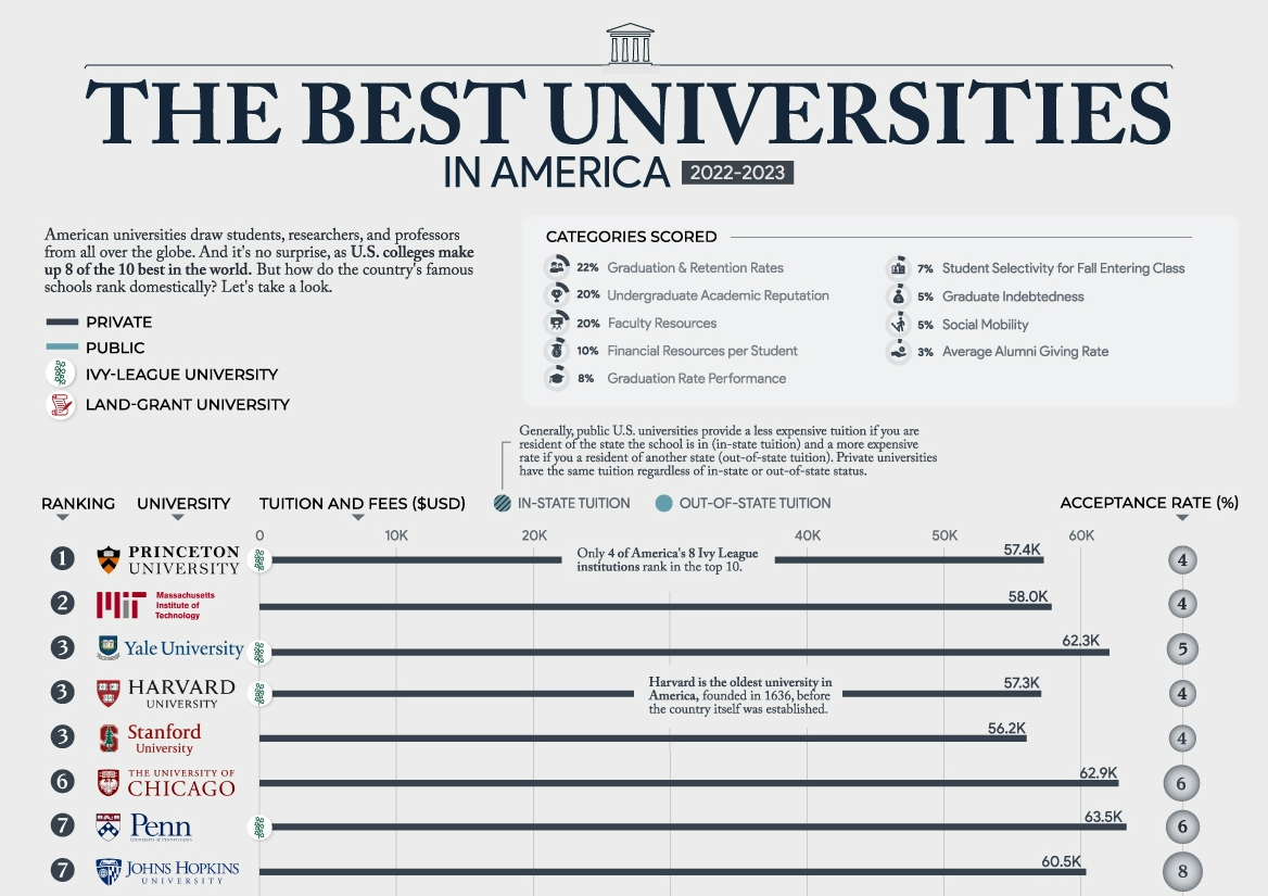 ๐Right - AKA the most expensive as well. [https://www.visualcapitalist.com/best-universities-in-america-2022/] Check it out at the link attached. Interesting also, though no surprise, that the vast majority of them are private, NOT public?