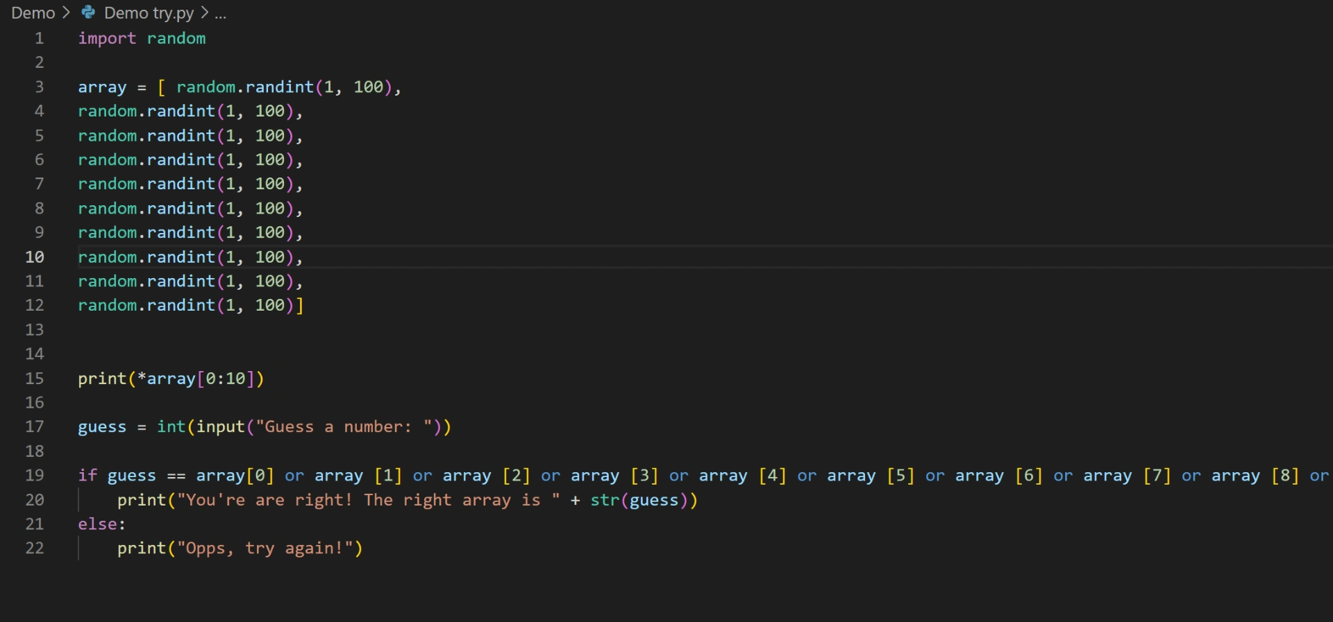 This is my initial way of coding it, it was clunky and had too many unnecessary lines, and it was unscalable if I need to generate hundreds of numbers instead of 10!